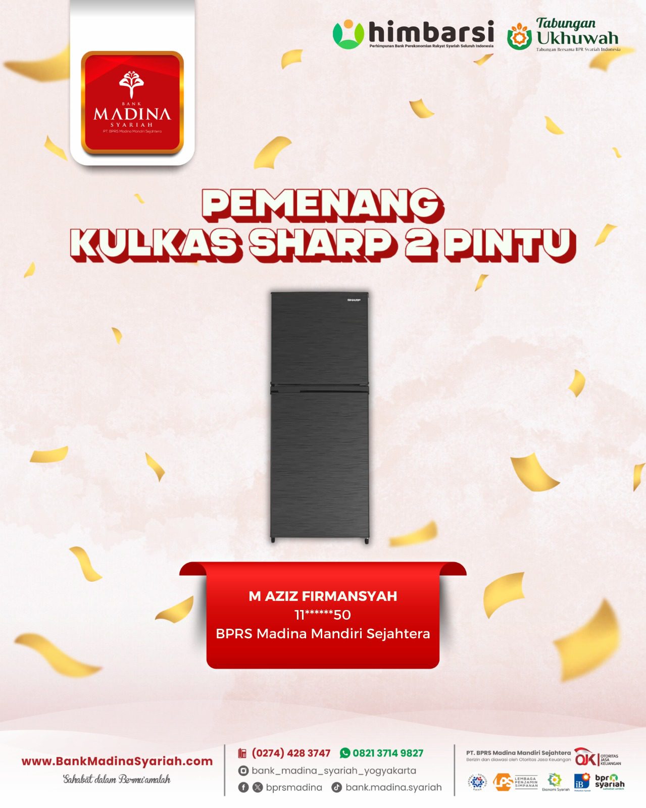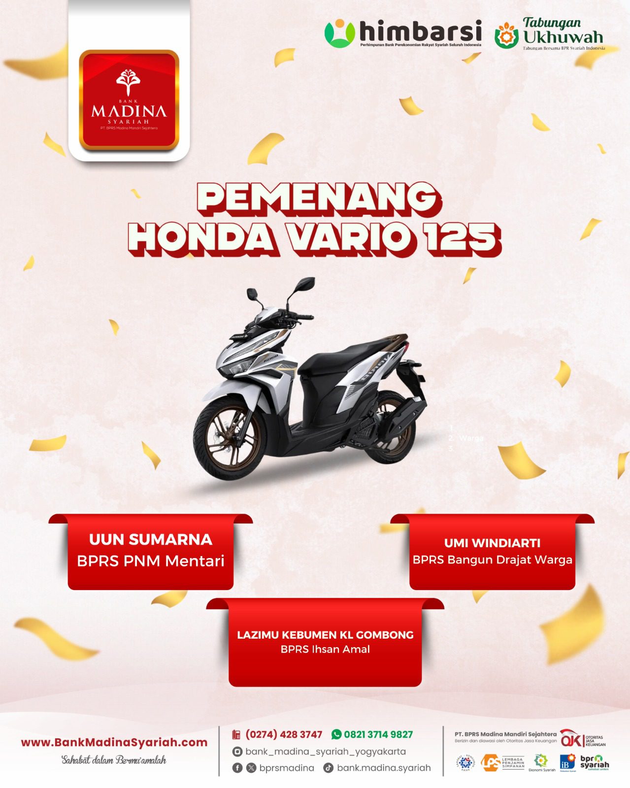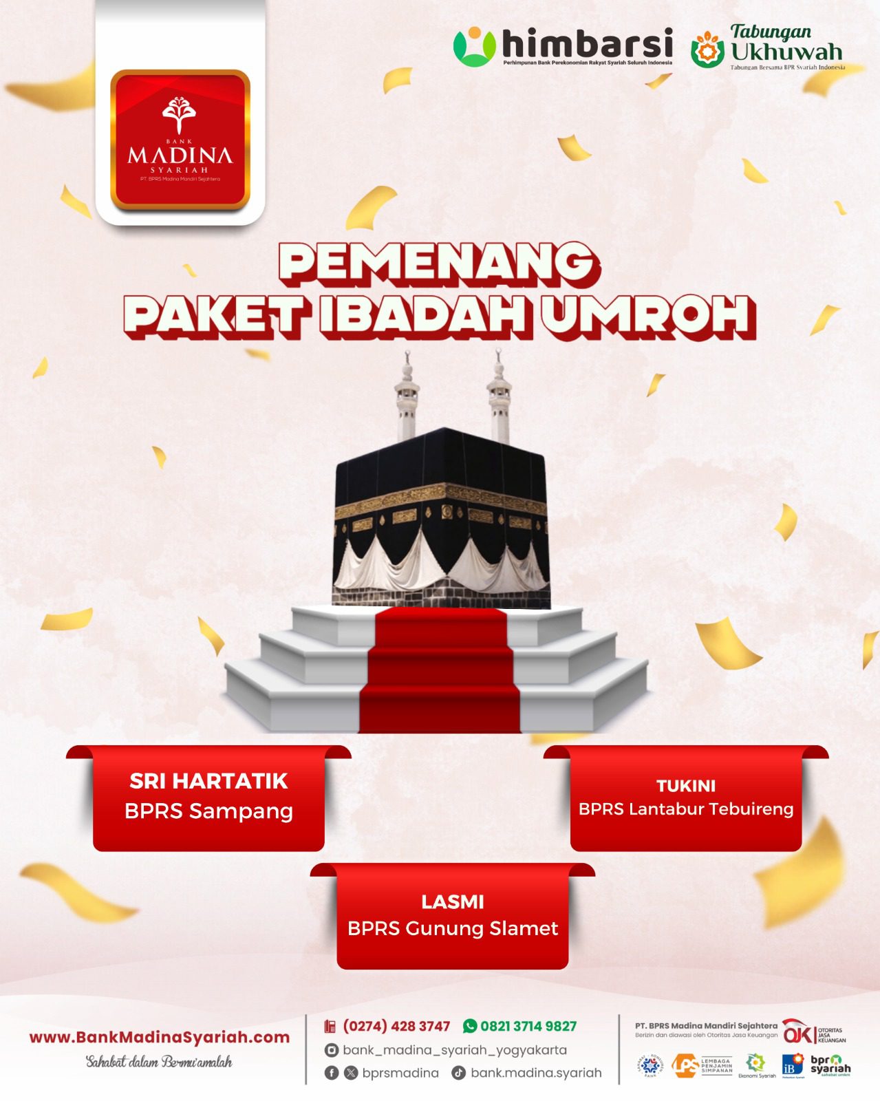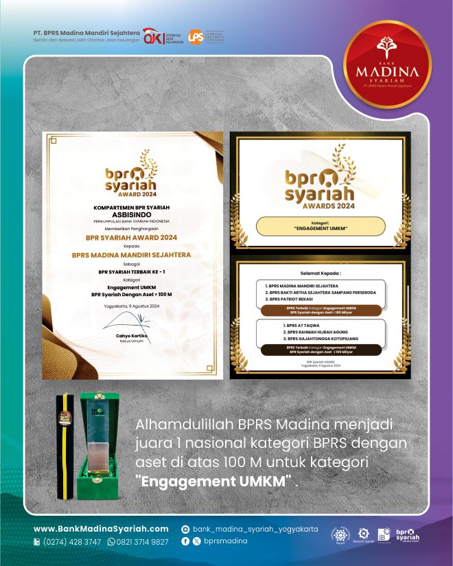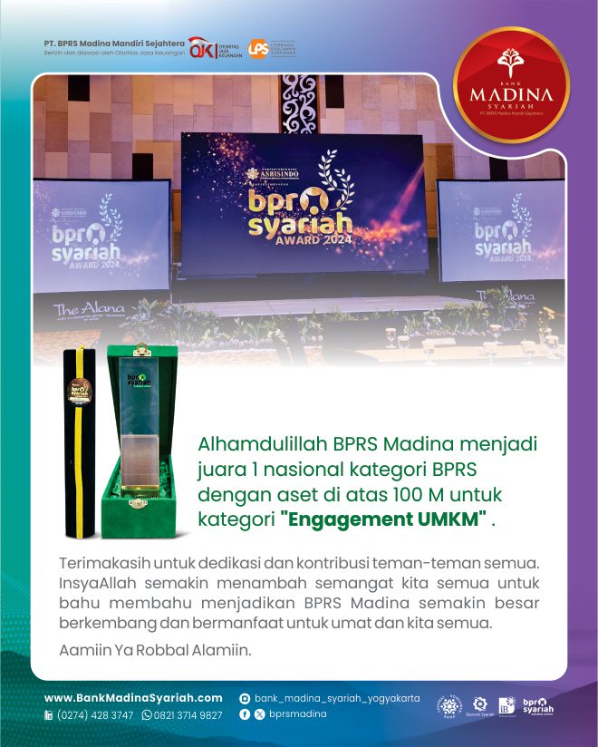 Alhamdulillah BPRS Madina menjadi juara 1 nasional kategori BPRS dengan aset di atas 100 M untuk kategori “Engagement UMKM”. Terima kasih untuk dedikasi dan kontribusi teman-teman semua. InsyaAllah semakin menambah semangat kita semua untuk bahu membahu menjadikan BPRS Madina semakin besar berkembang dan bermanfaat untuk umat dan kita semua. Aamiin.