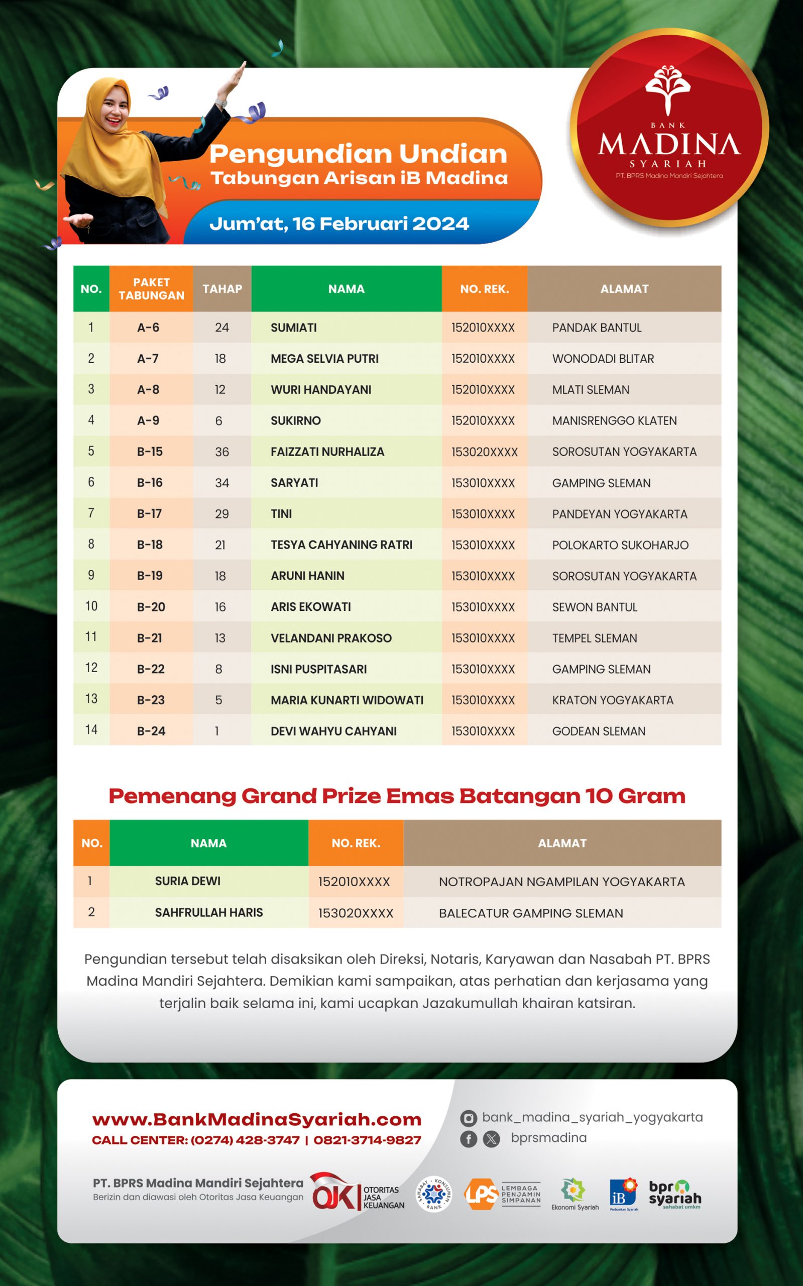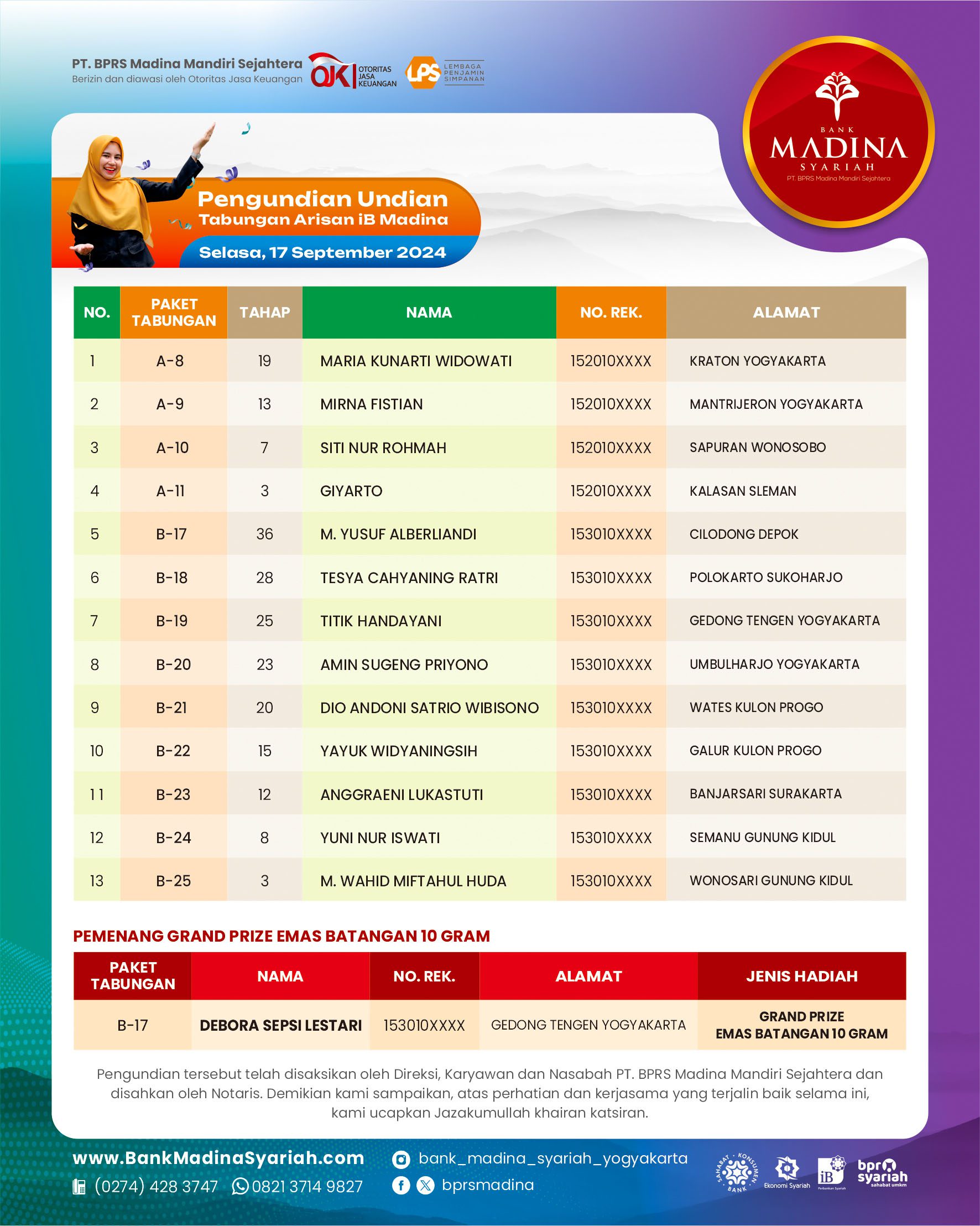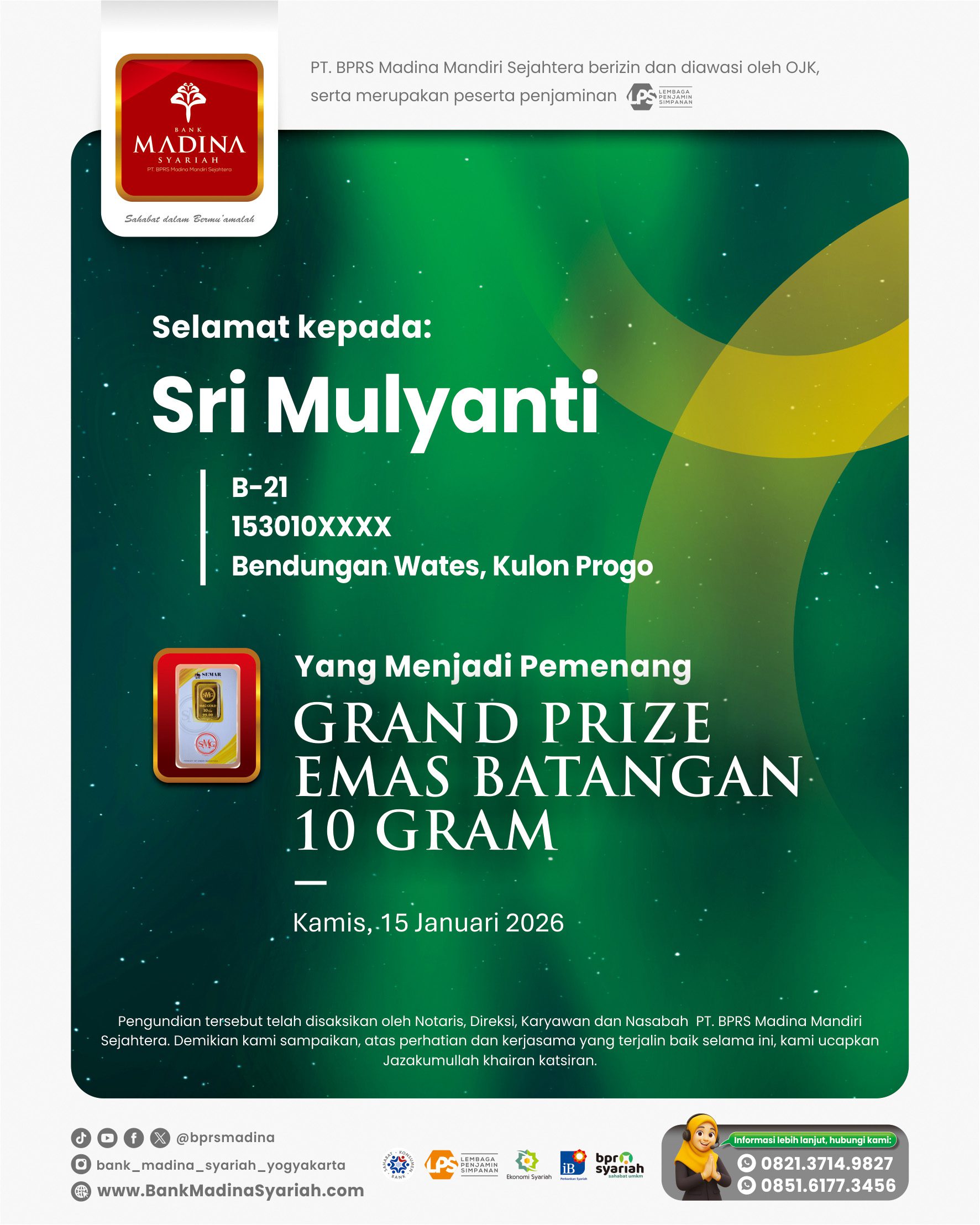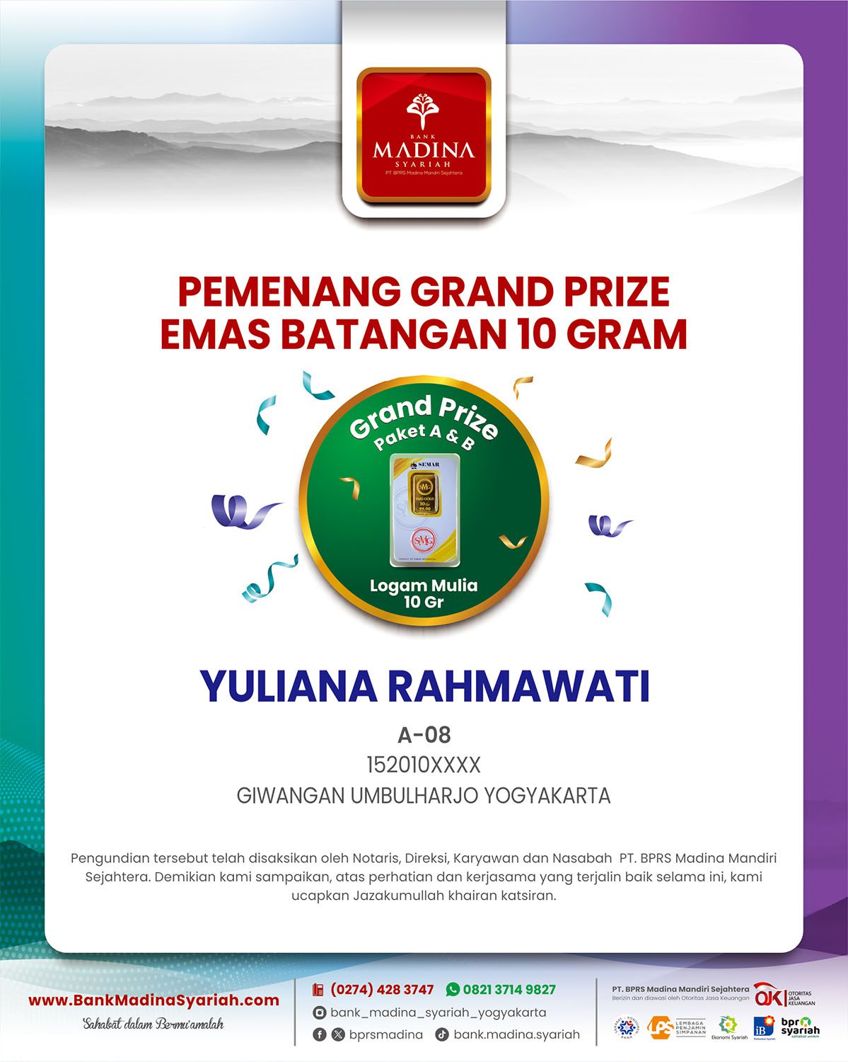 Alhamdulillah BPRS Madina menjadi juara 1 nasional kategori BPRS dengan aset di atas 100 M untuk kategori “Engagement UMKM”. Terima kasih untuk dedikasi dan kontribusi teman-teman semua. InsyaAllah semakin menambah semangat kita semua untuk bahu membahu menjadikan BPRS Madina semakin besar berkembang dan bermanfaat untuk umat dan kita semua. Aamiin.