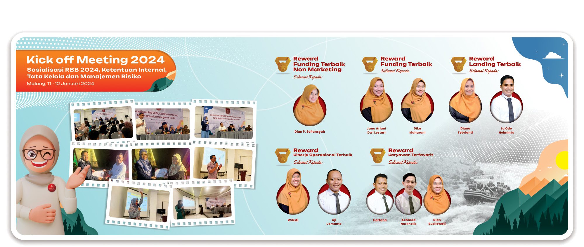 Pada hari Kamis 11 Januari 2024 Bank Madinah Syariah telah menyelenggarakan Kick off Meeting dengan tema “Sosialisasi RBB 2024 Ketentuan Internal, Tata Kelola dan Manajemen Risiko”. Kegiatan dilaksanakan di hotel Grand Whizz Bromo Jawa Timur, yang dipimpin langsung oleh Direktur Utama Bank Madina Syariah yaitu bapak Sabdo Nugroho. Turut hadir juga jajaran komisaris dan juga dewan pengawas Syariah serta diikuti oleh seluruh karyawan Bank Madina Syariah. Dalam rangkaian acara Kick off Meeting tersebut sekaligus juga acara pemberian Award kepada beberapa karyawan atas pencapaian prestasi kinerja di tahun 2023. Acara tersebut ditutup dengan perjalanan ke puncak Bromo dan Rafting di sungai Brantas di Jawa Timur.